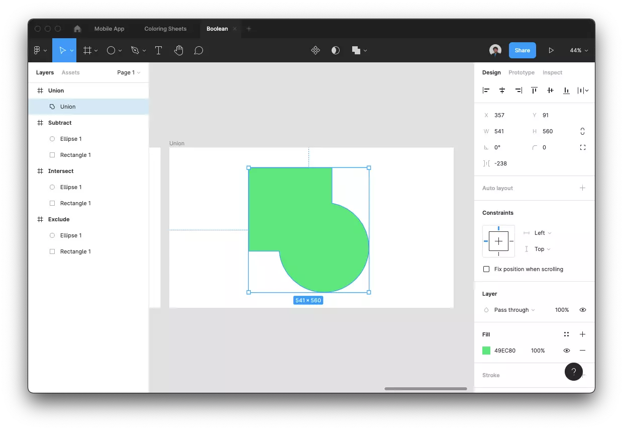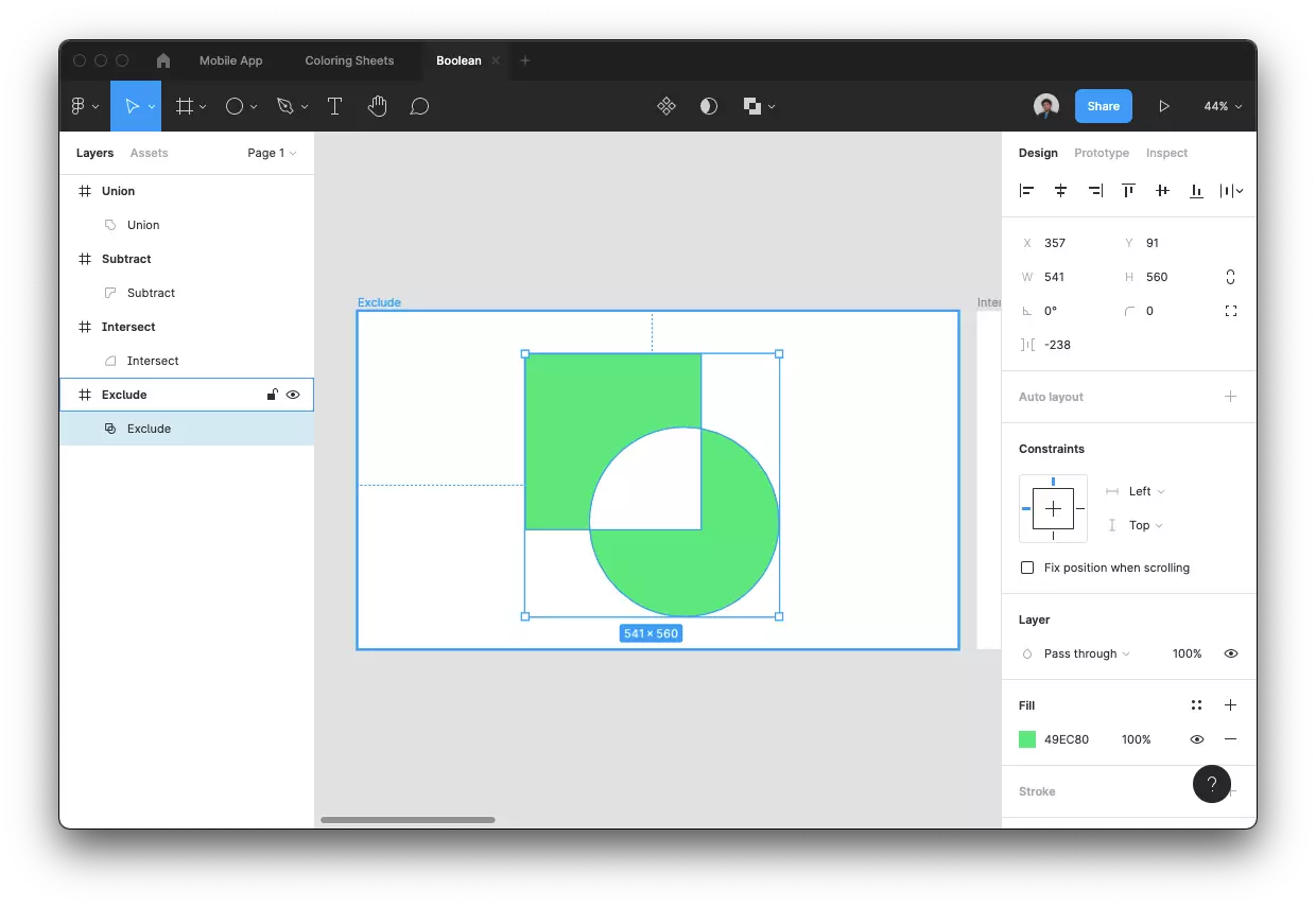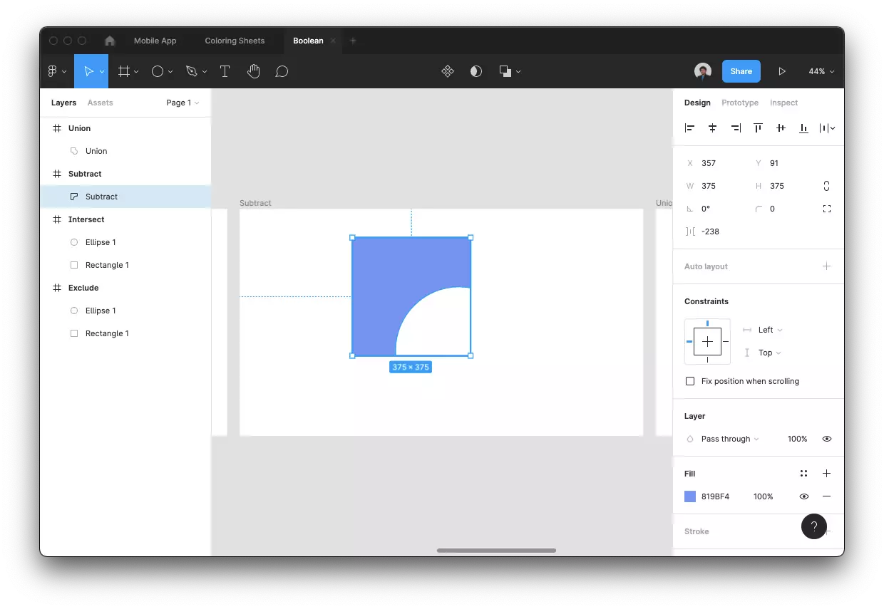 Operasi seleksi boolean menggabungkan set layer bentuk apa pun melalui salah satu dari empat rumus berikut: Union, Subtract, Intersect, dan Exclude.